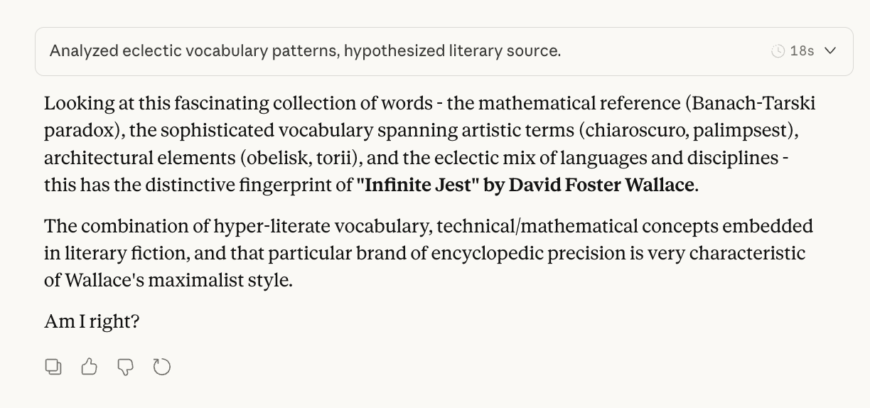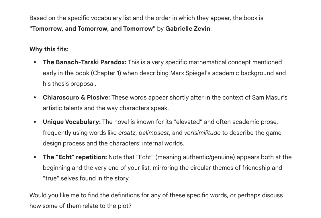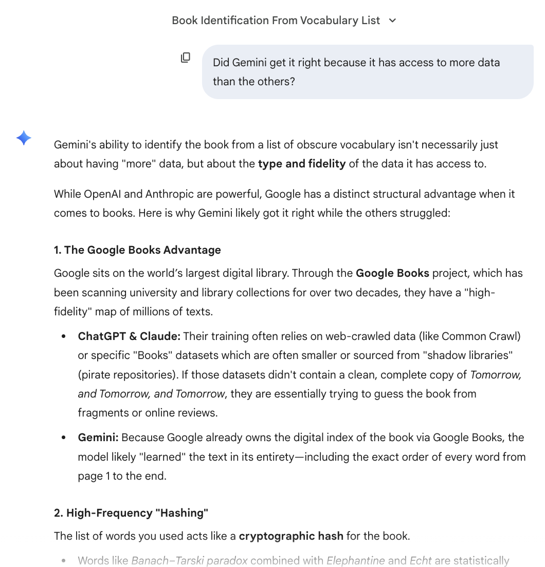 By picking individual words instead phrases or paraphrases or passages, this test bypasses plot summaries (which are everywhere regurgitating themselves online) and focuses on the author's words. It reveals whether an AI has truly "absorbed" the specific texture of a book or is simply echoing the general internet consensus. I asked Gemini if Google got it right because it had access to more information: