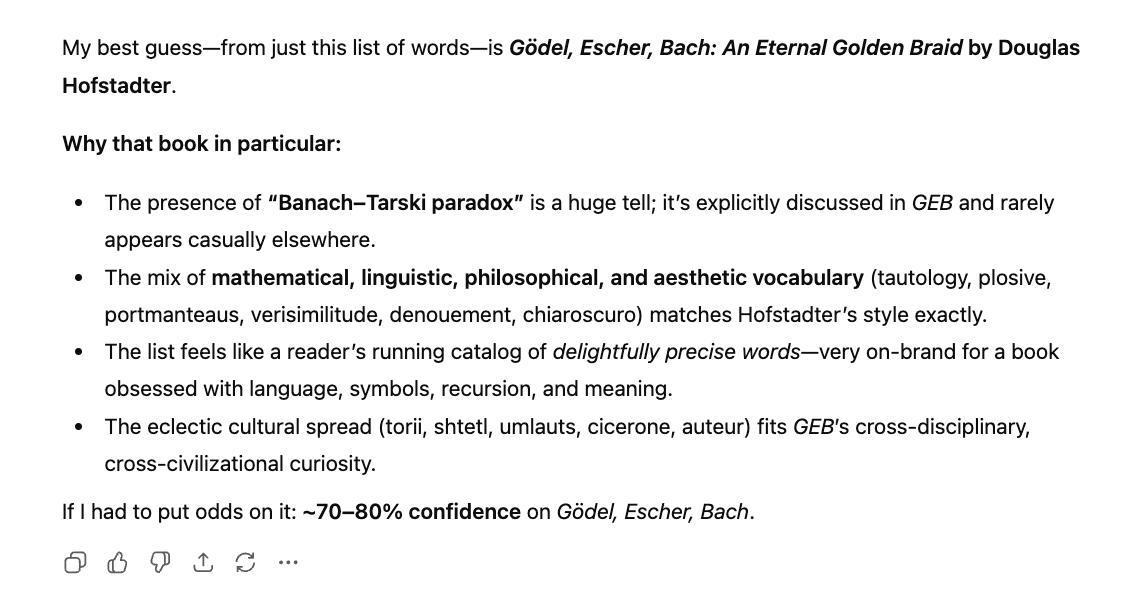 One of the three AIs correctly guessed the book. The other two did not. I replied "guess again" 10x and they each guessed a lot of interesting books (to name a few repeated ones: The Dictionary of Lost Words, Permutation City, Foucault’s Pendulum, The Secret History, Infinite Jest, The Name of the Rose, The Overstory, and Gödel, Escher, Bach: An Eternal Golden Braid) but not the one I just read. Now, which book is it?